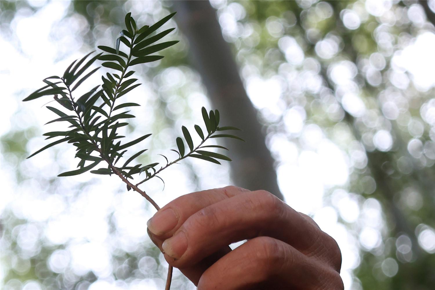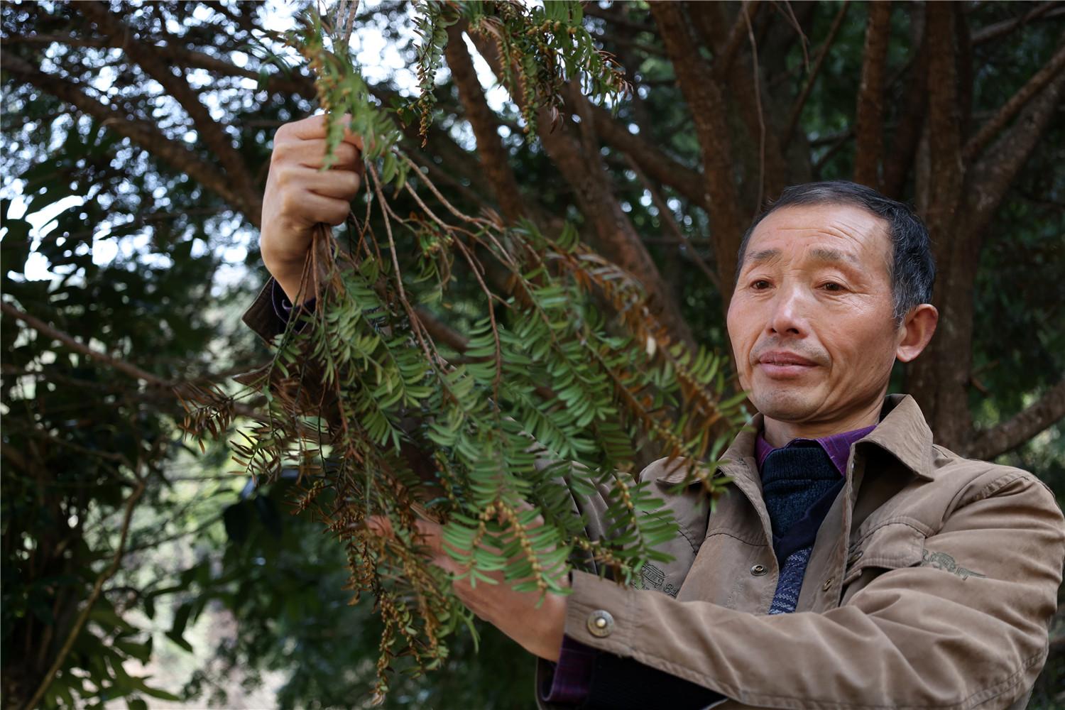 3月8日,邓学毛在仔细观察红豆杉树叶的生长情况。