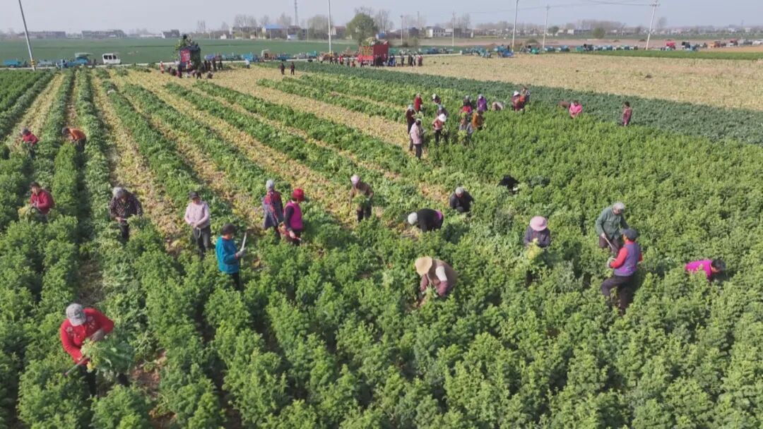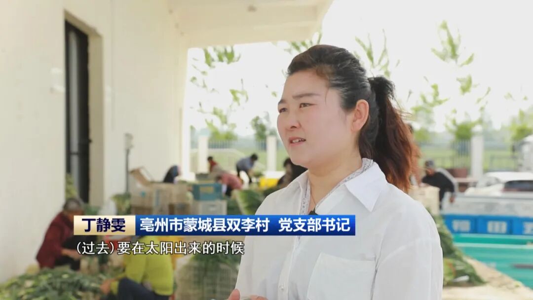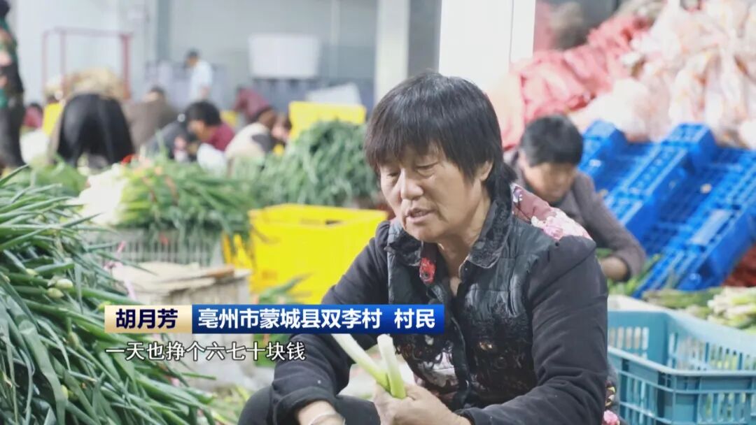 在亳州市蒙城县双李村蔬菜车间,70多位村民今天的任务是剥葱,近10吨的大葱去皮掐须,和土豆等蔬菜一起进入村里的冷库。蔬菜在冷库进行一夜的预冷后,温度会降到0度,即便经过几个小时的长途运输,到了批发市场依然“颜值在线”,也能卖个好价。而在过去,当地菜农们半夜起来收菜是常有的事。