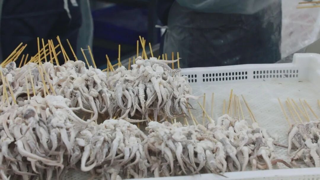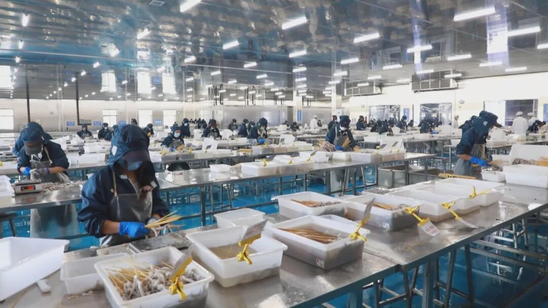 冷库里装着原料也装着成品,一进一出,就是上亿元的大生意。像这样一个加工车间,可以容纳300人就业,一天处理鱿鱼原料20吨。