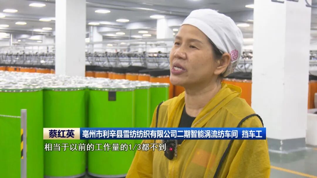 在亳州市利辛县,雪纺纺织刚投产的智能涡流纺机正高速运转、吞纱吐丝。干了30多年挡车工的蔡红英,只需轻点电子屏幕,就能轻松控制7台纺机,600多枚纱锭以平均每分钟500米的速度纺纱成线。