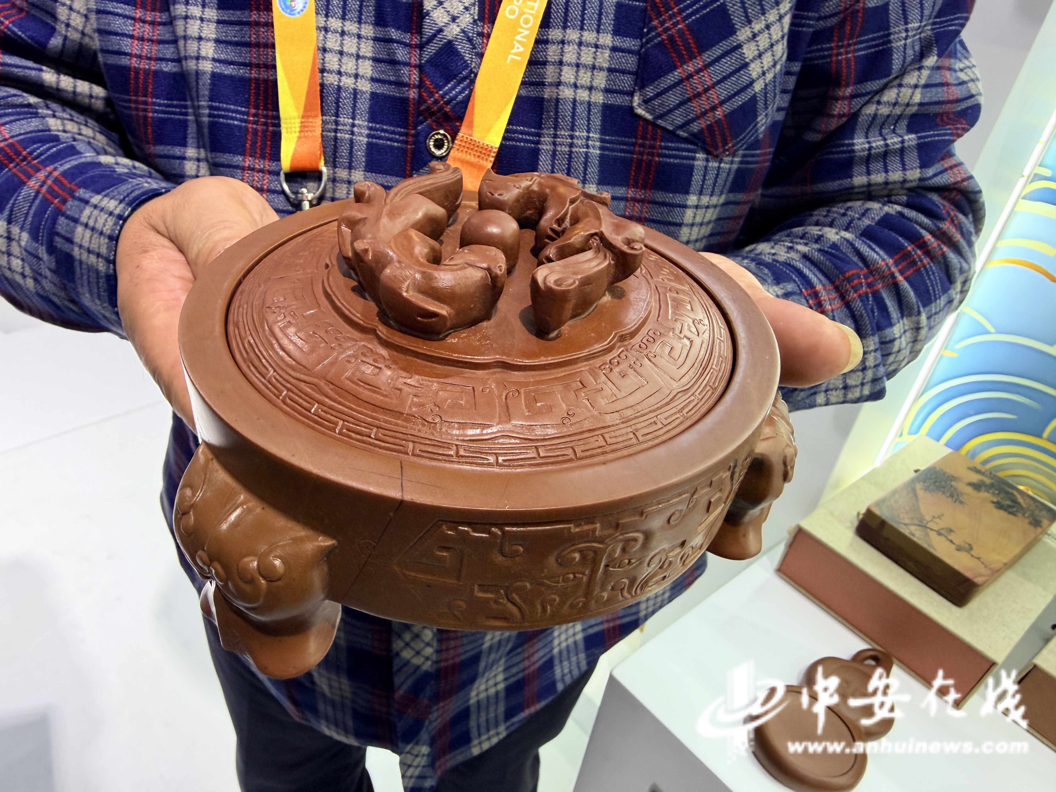 记者看到,鼎型砚台的纹理也是模仿文物上的花纹制作的,这些砚台打开可以使用,合上是一个精美的工艺品,更展现了淮南丰富的历史文化,价格也从几百到数千不等,既有适合日常使用的,也有可以收藏观赏的。邱金保表示,希望在进博会的平台上,让更多国际友人了解安徽传统文化。