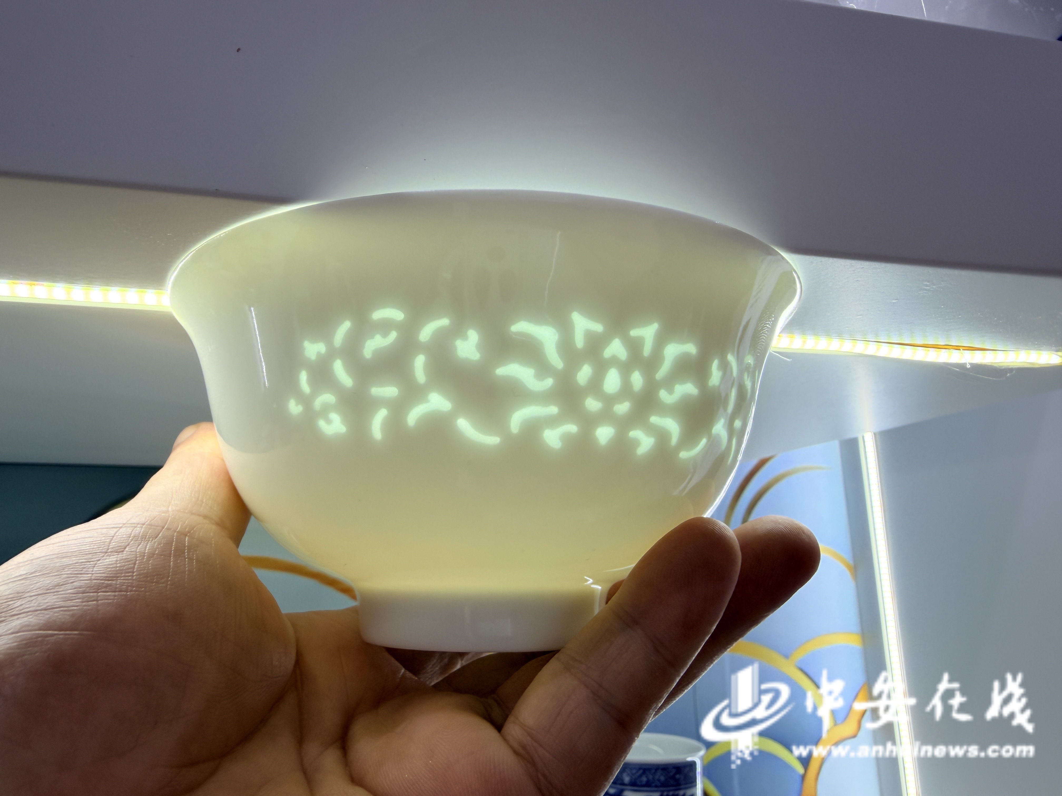 “叮……”一声清脆的“碰瓷”声甚是悦耳,这是安徽工艺美术大师张传军带来的瓷碗轻碰发出的声响。他告诉记者,这种陶瓷是先雕刻再填釉,二次烧成,自带镂空图案。“这属于高温玲珑瓷,具有密度高、不烫手、易清洗、亮度高等优点,端在手上,手感也会更加莹润。”